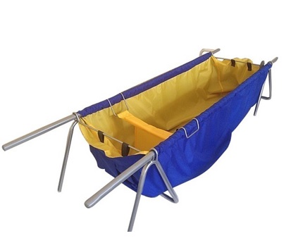 Ванна складная состоит из металлических опор и водонепроницаемой тканевой емкости для воды. Также в комплект входит специальный ремень для поддержки головы больного и гибкий шланг.